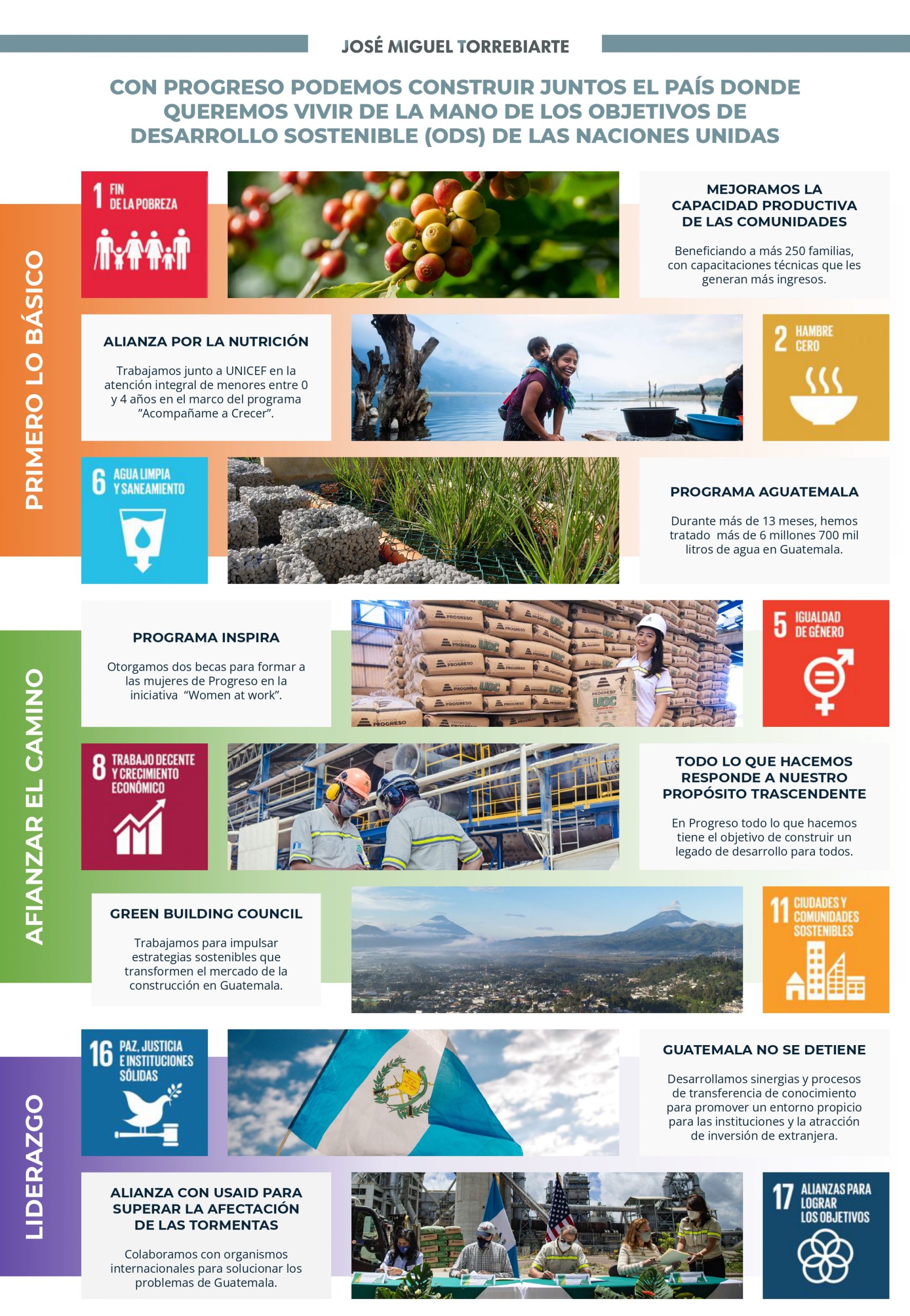 Desde Progreso, trabajamos de la mano de las familias residentes en las zonas aledañas a nuestra Planta San Gabriel en programas de capacitación que mejoran sus capacidades productivas, sus ingresos y les permiten desarrollar un modelo de vida sostenible para sí mismos y las comunidades a las que pertenecen. Programas y actividades como la promoción de exportación de rosas locales, la caficultura sostenible, o PACUNAM (que promociona la conservación de y turismo sostenible de nuestra herencia maya) son ejemplos de algunas iniciativas que contribuyen a la agenda 2030 en los relacionado con la superación de de la pobreza (ODS número 1).